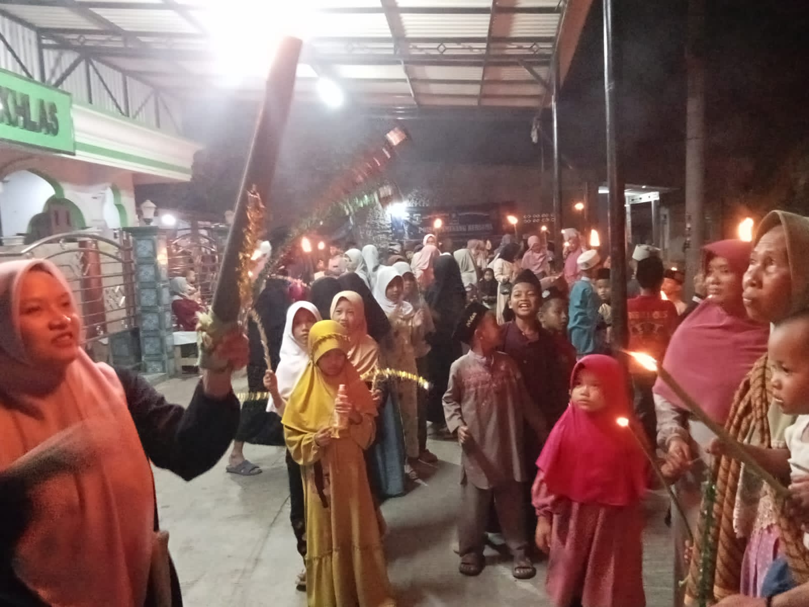 Para peserta yang mengikuti kegiatan pawai obor, para Alim ulama tokoh masyarakat, ibu ibu majlis taklim Remaja masjid Al-ikhlas (Risma) dan anak anak dari usia TK, SD, sampai SMA masyarakat sekitar lingkungan Desa Tanah Merah.