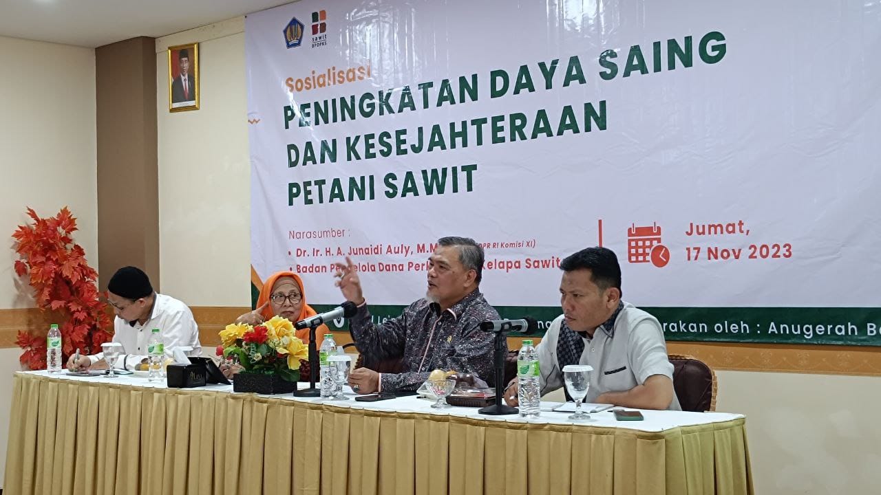 PATRIOTNUSANTARANEWS.COM | TULANG BAWANG – Anggota Komisi XI DPR RI Junaidi Auly mengapresiasi kegiatan sosialisasi Peningkatan Daya Saing dan Kesejahteraan Petani Sawit di Le’Man Hotel Kabupaten Tulang Bawang. Kamis 30/11/2023.