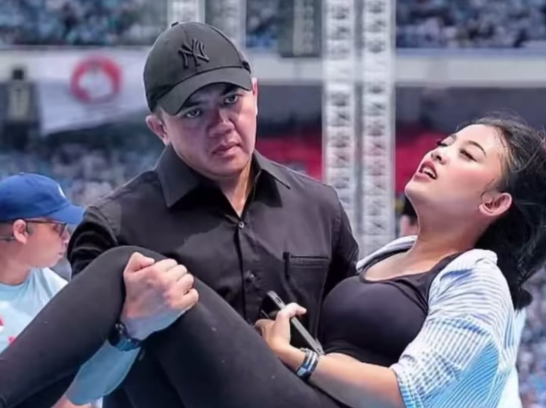 Di tengah orasi, seorang perempuan mendadak pingsan di depan Prabowo. Teddy pun bergegas berlari ke korban dan langsung membopongnya ke belakang panggung.