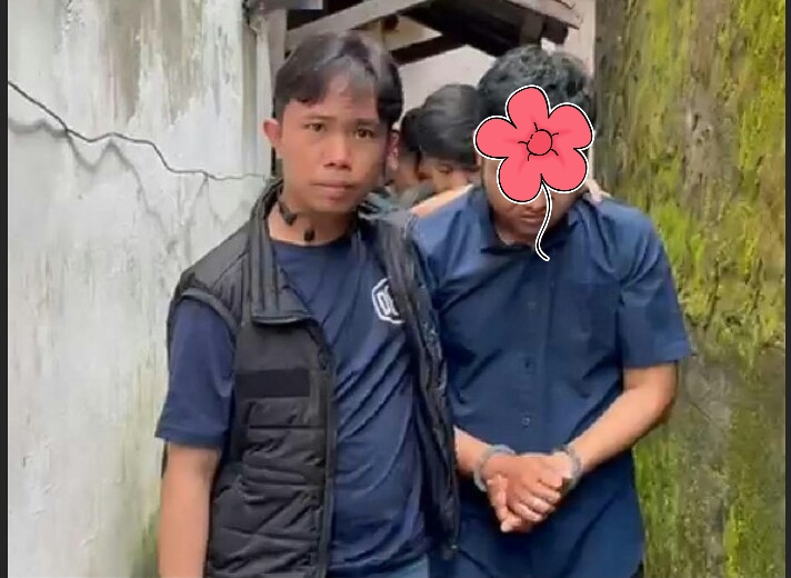 Pelaku pun tertunduk selama proses penangkapan tersebut. Dia kemudian dibawa dan diarahkan untuk duduk di kursi belakang mobil Fortuner berwarna hitam.