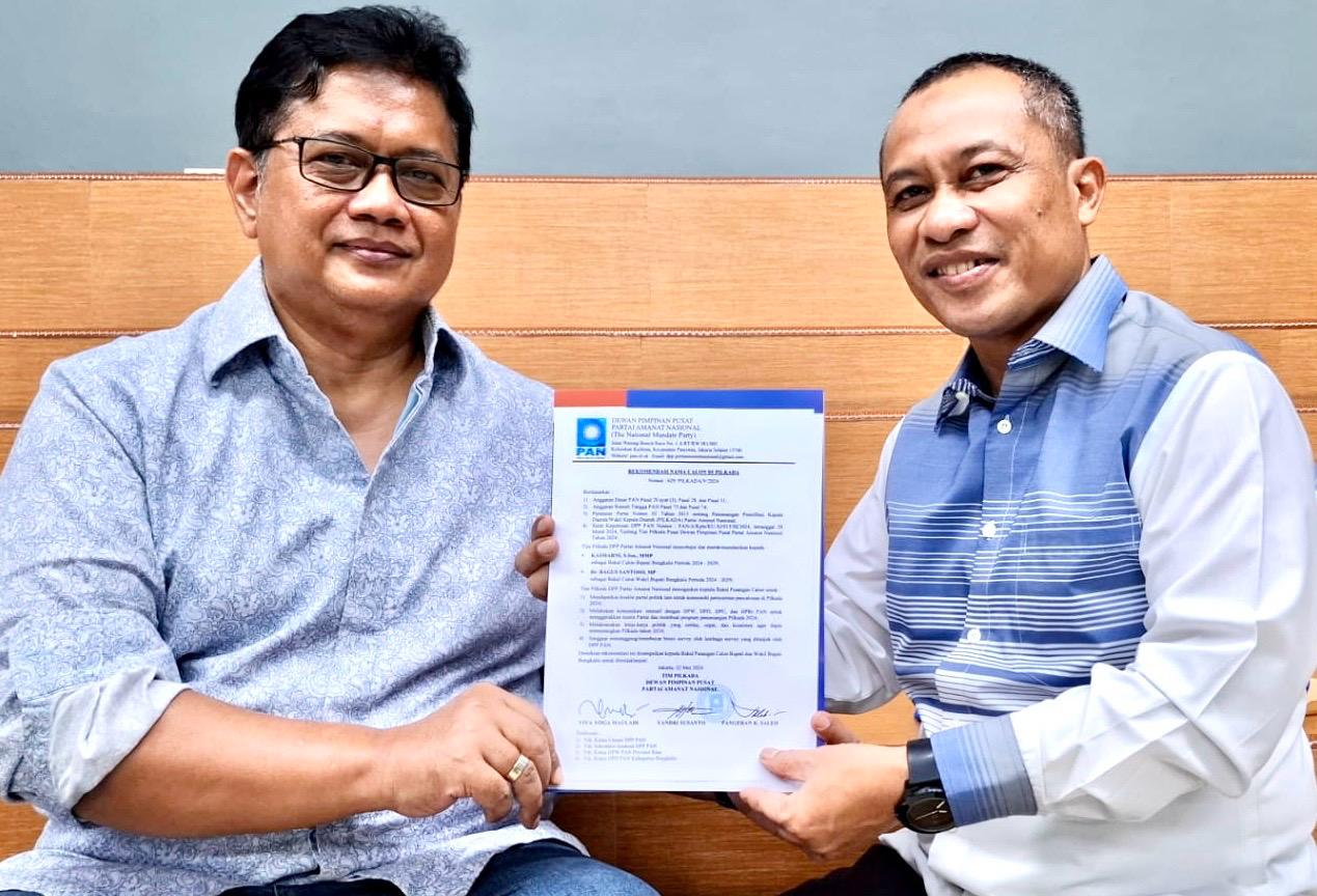 Surat Keputusan diserahkan langsung Tim Pilkada DPP PAN Viva Yoga Mauladi kepada Bagus Santoso pada hari Kamis 30 Mei 2024 di Jakarta.