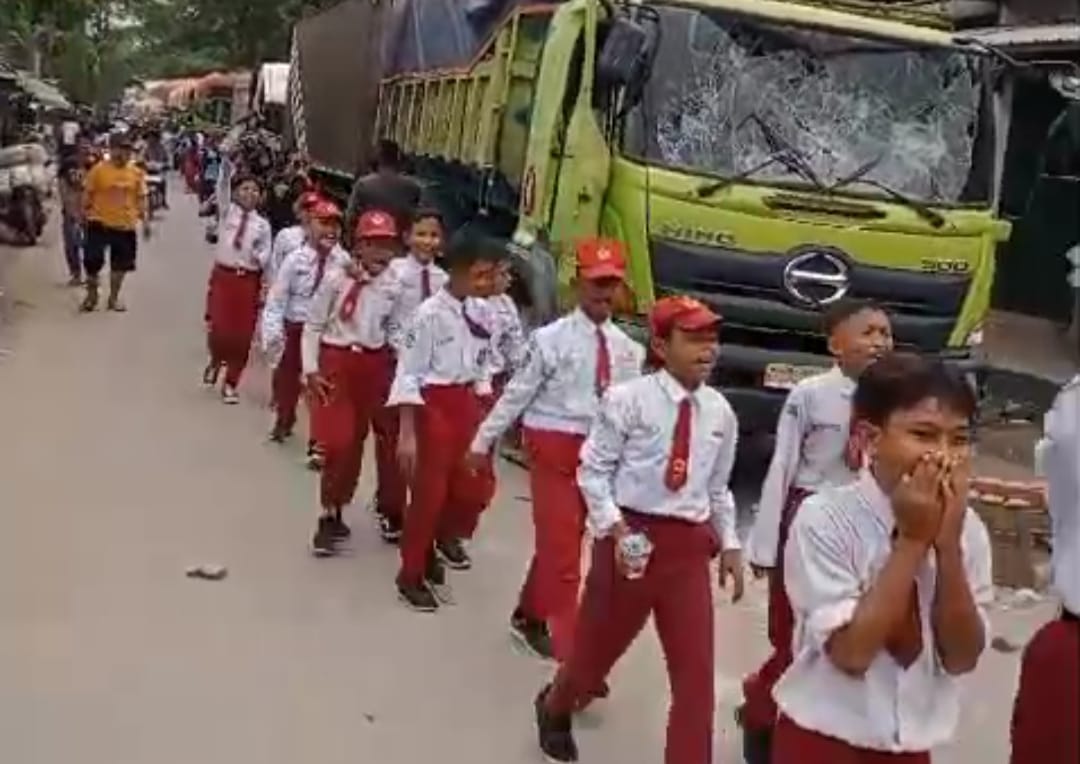 PATRIOTNUSANTARANEWS.COM | KAB TANGERANG – Tak terima teman mereka terlindas truk pengangkut tanah, puluhan siswa-siswi Sekolah Dasar (SD) Negeri Salembaran 2 Kecamatan Kosambi menggelar aksi sambil menangis dan membentangkan poster bertuliskan “Jam Operasional Truk Tambang Mulai dari Pukul 22:00 WIB, hingga Pukul 05:00 WIB, stop di jam kerja”.