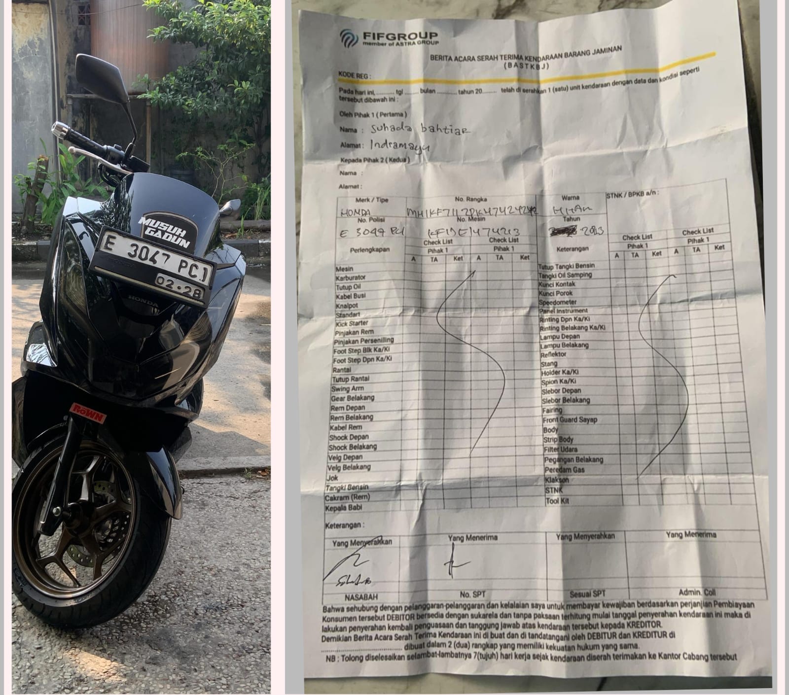 Sementara 7 (Tujuh) orang’ Oknum Matel membawa kabur motor Honda PCX Tahun 2023, Warna Hitam, dengan Nomor Polisi E-3047-PCI, STNK, dan kunci kontak. Lebih mengejutkan lagi, Oknum Matel tersebut menggunakan Berita Acara Serah Terima Kendaraan (BASTK) yang diduga BODONG!! Alias PALSU.!! dengan meniru logo Leasing FIF (Pembiayaan Kredit Bermotor).