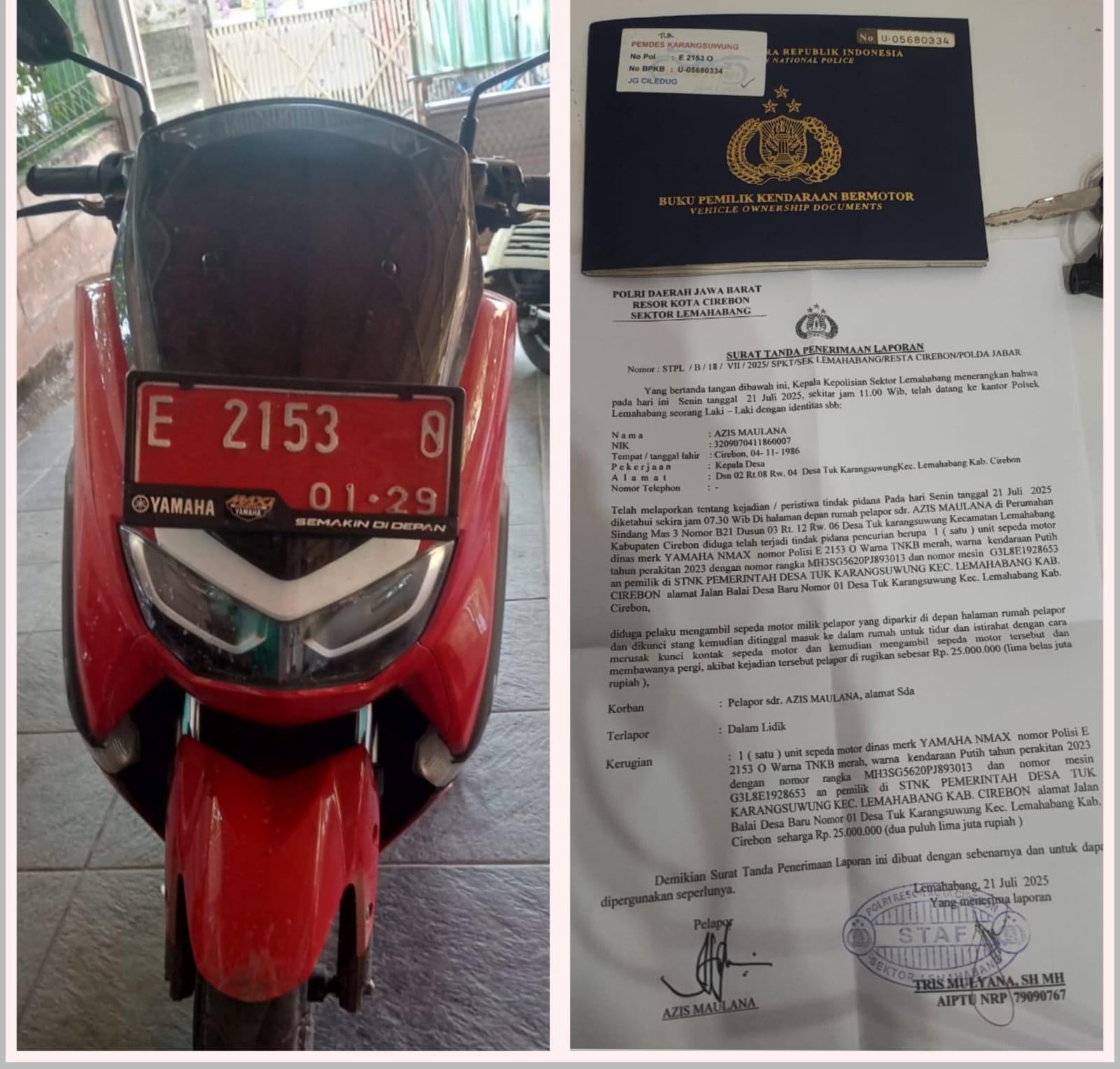 Kuwu Azis Maulana menyampaikan kepada awak Media melalui WhatsApp, pada Rabu (30/7/2025), “Motor Nmax tersebut didalam joknya, ada tas berisi HP, Charger, Dompet, STNK, SIM A, SIM C, ATM, Surat Tanah Asli, dokumen-dokumen kerjaan, stempel catatan kerjaan, kunci rumah, kunci Workshop, kunci Kantor Desa dan berkas lainnya,” jelas Azis Maulana.