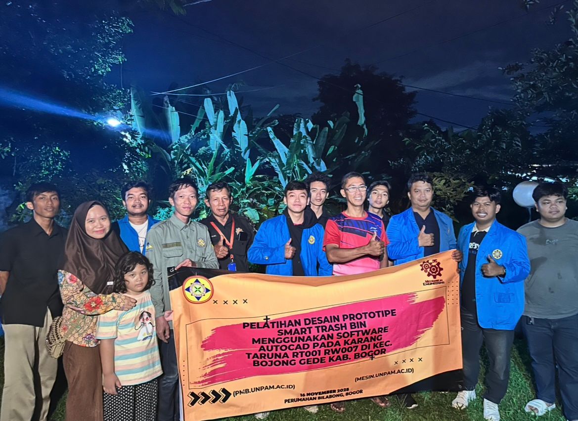 PATRIOTNUSANTARANEWS.COM | BOGOR – Dalam rangka Pengabdian Kepada Masyarakat (PKM) Mahasiswa dan Dosen Teknik Mesin Universitas Pamulang (Unpam) melakukan edukasi sosialisasi dan pelatihan desain prototipe smart trash bin menggunakan software autocad kepada masyarakat yang dihadiri oleh Muhammad Isro Diyanto, S.T, M.T., Tatang Suryana S.T, M.T., para Dosen Teknik Mesin Unpam beserta Mahasiswa, dan Warga setempat di Perumahan Billabong Blok C 11 nomor 10 Jalan Rajawali 8 RT 001 RW 007  Kelurahan Cimanggis Kecamatan Bojong Gede Kabupaten Bogor pada tanggal 13-14 Nov 2025.