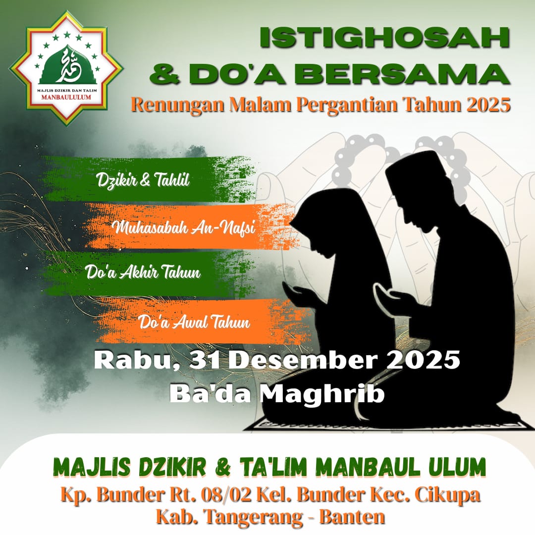 PATRIOTNUSANTARANEWS.COM | KAB TANGERANG – Majlis Dzikir dan Ta’lim Manbaul Ulum Dan pengurus Pimpinan Ranting Nahdatul Ulama (PRNU) Kampung Bunder, RT 008 RW 02, Kecamatan Cikupa, Kabupaten Tangerang, Banten, akan mengadakan gelar malam Istighosah dan Do’a Bersama pada Rabu, 31 Desember 2025