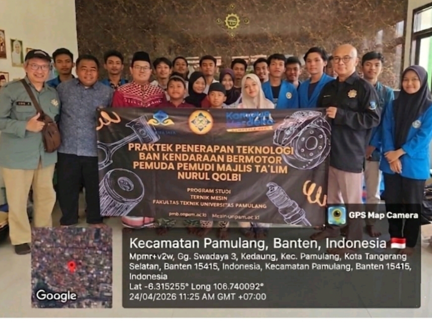 PATRIOTNUSANTARANEWS.COM | TANGSEL – Dosen dan Mahasiswa Teknik Mesin Universitas Pamulang (Unpam) melaksanakan Kegiatan Pengabdian Masyarakat (PKM) semester genap 2025-2026 sebagai salah satu kegiatan Tri Darma Perguruan Tinggi. Pelaksanaan kegiatan berupa Praktek Penerapan Teknologi Ban Sepeda Motor Kepada Pemuda Pemudi Majlis Ta’lim Nurul Qolbi di Gang Swadaya 3 Kedaung Pamulang Tangerang Selatan Provinsi Banten. Pada hari Jumat,24 April 2026.